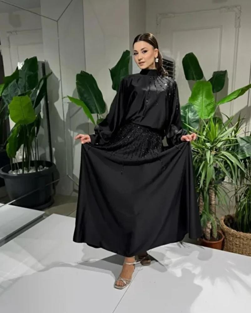 - يتميز فستان اسود ناعم بتصميمه البسيط والراقي الذي يجمع بين الأناقة والراحة